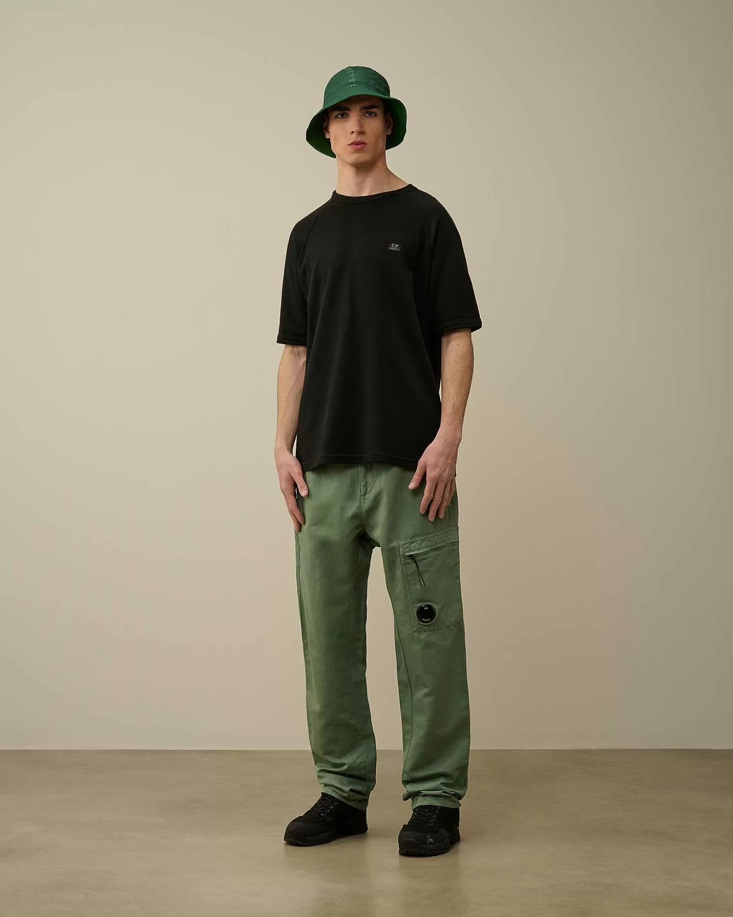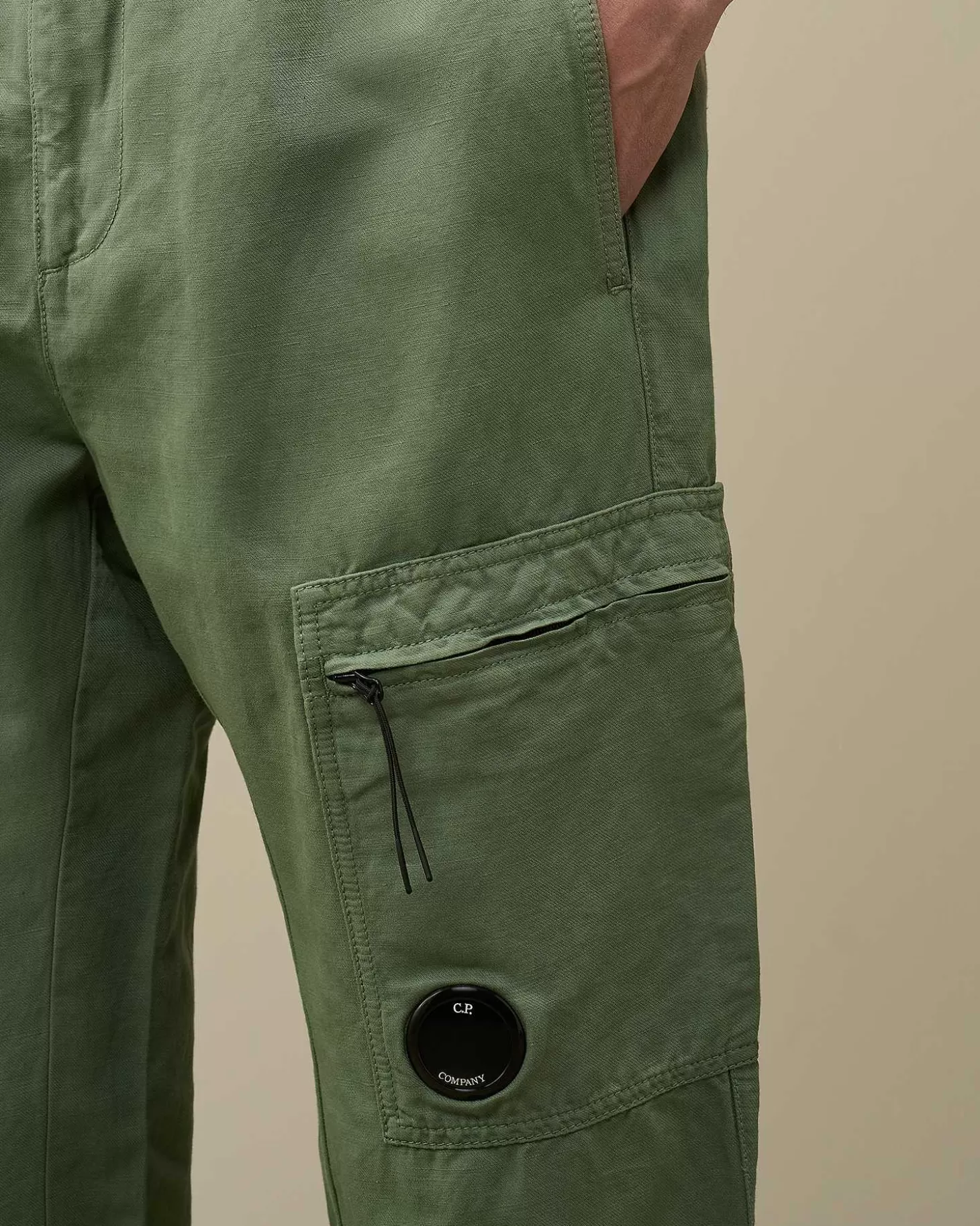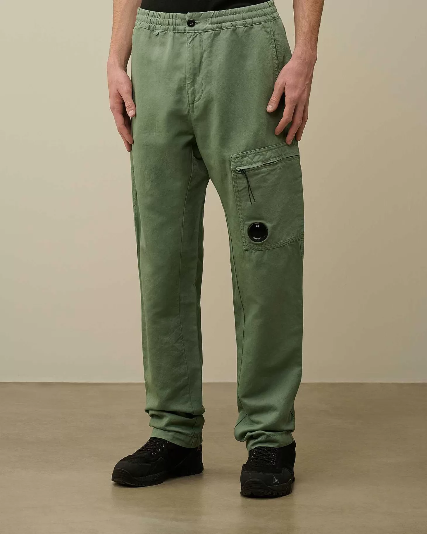 Pantalon Cargo Avec Taille Élastique À Cordons De Serrage, Braguette Zippée Surmontée D’Un Bouton Et Deux Poches En Biais Pour Les Mains. Ce Modèle Présente Également Une Poche Arrière Avec Logo Brodé Et Une Poche Zippée Sur La Jambe Portant Le Détail En Forme De Verre De Lunette C.P. Company. Modèle Confectionné Dans Un Mélange De Coton Et De Lin, Puis Teint En Pièce Pour Plus De Profondeur Et D’Intensité Dans Les Couleurs. Coupe Droite.