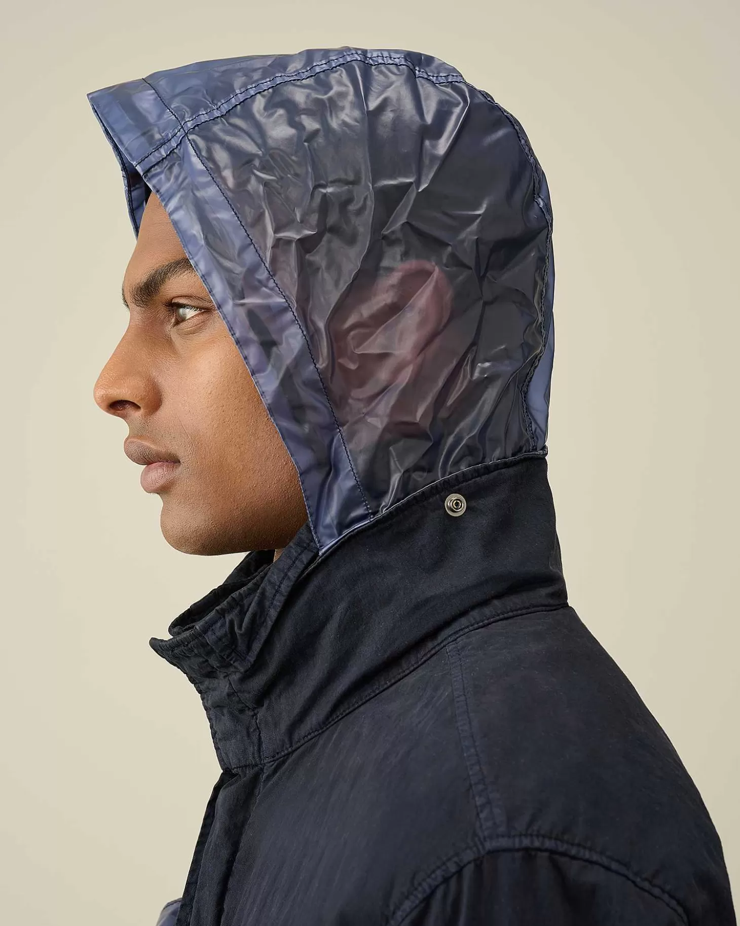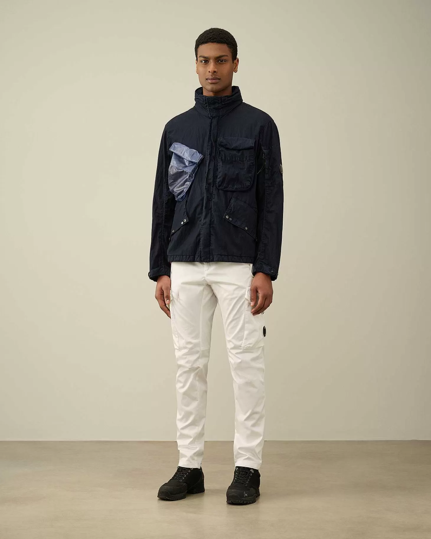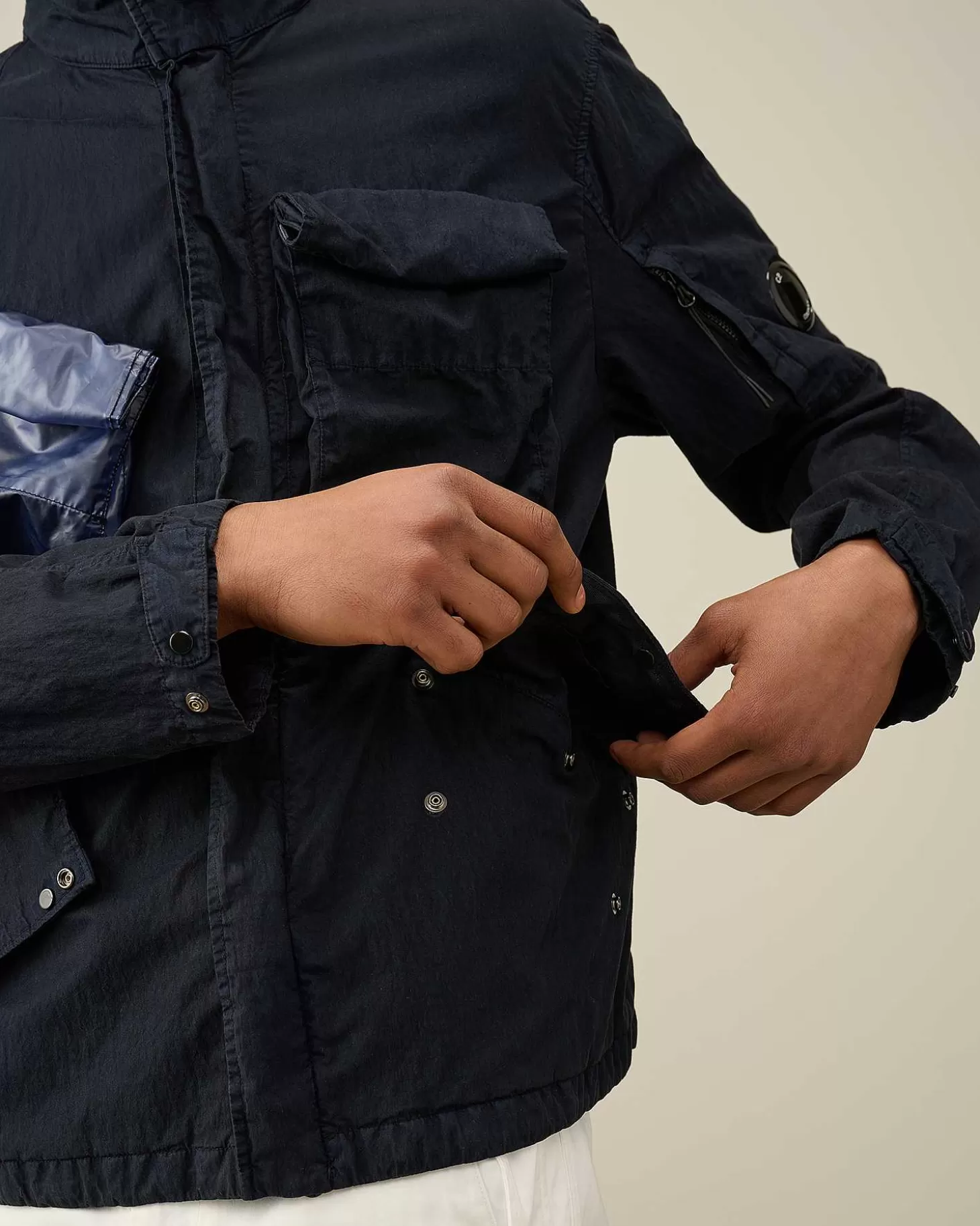 Cette Veste Présente Un Col Montant, Une Capuche Compactable Et Une Fermeture Zippée Dissimulée Tout Du Long. Une Poche Sur La Manche Gauche Portant Le Détail En Forme De Verre De Lunette C.P. Company, Deux Poches Poitrine Sécurisées, Deux Poches En Biais Pour Les Mains, Ainsi Que Des Poignets Et Un Ourlet Réglables Complètent L’Ensemble. Modèle Confectionné En Pium Et 50 Fili, Un Mélange De Nylon Et De Coton Emprunté Aux Parkas Militaires Américaines.Le Revêtement En Polyuréthane Améliore Sa Résistance À L’Eau Et Lui Confère Un Fini Ton Sur Ton Contrasté À L’Issue Du Processus De Double Teinture En Pièce. Coupe Droite.