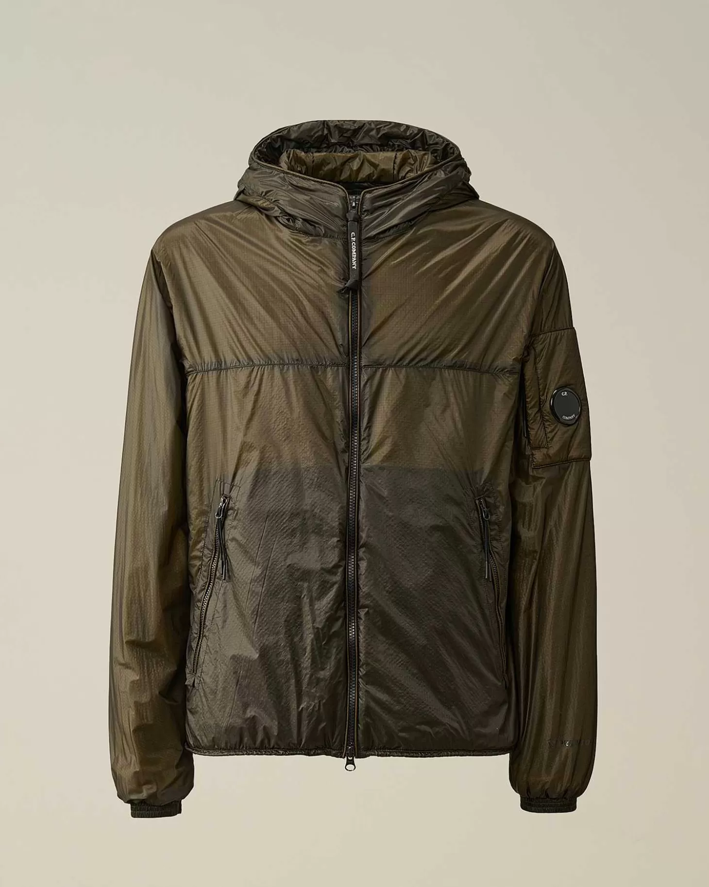 Veste Courte À Capuche Réglable Et Fermeture Zippée Tout Du Long. Une Poche Sur La Manche Portant Le Détail En Forme De Verre De Lunette C.P. Company, Deux Poches Avant En Biais Et Un Ourlet Réglable Complètent Cette Veste. Modèle Confectionné En Nada Shell, Un Tissu Indéchirable Ultra-Léger 7 Deniers Avec Rembourrage Primaloft. Coupe Droite.